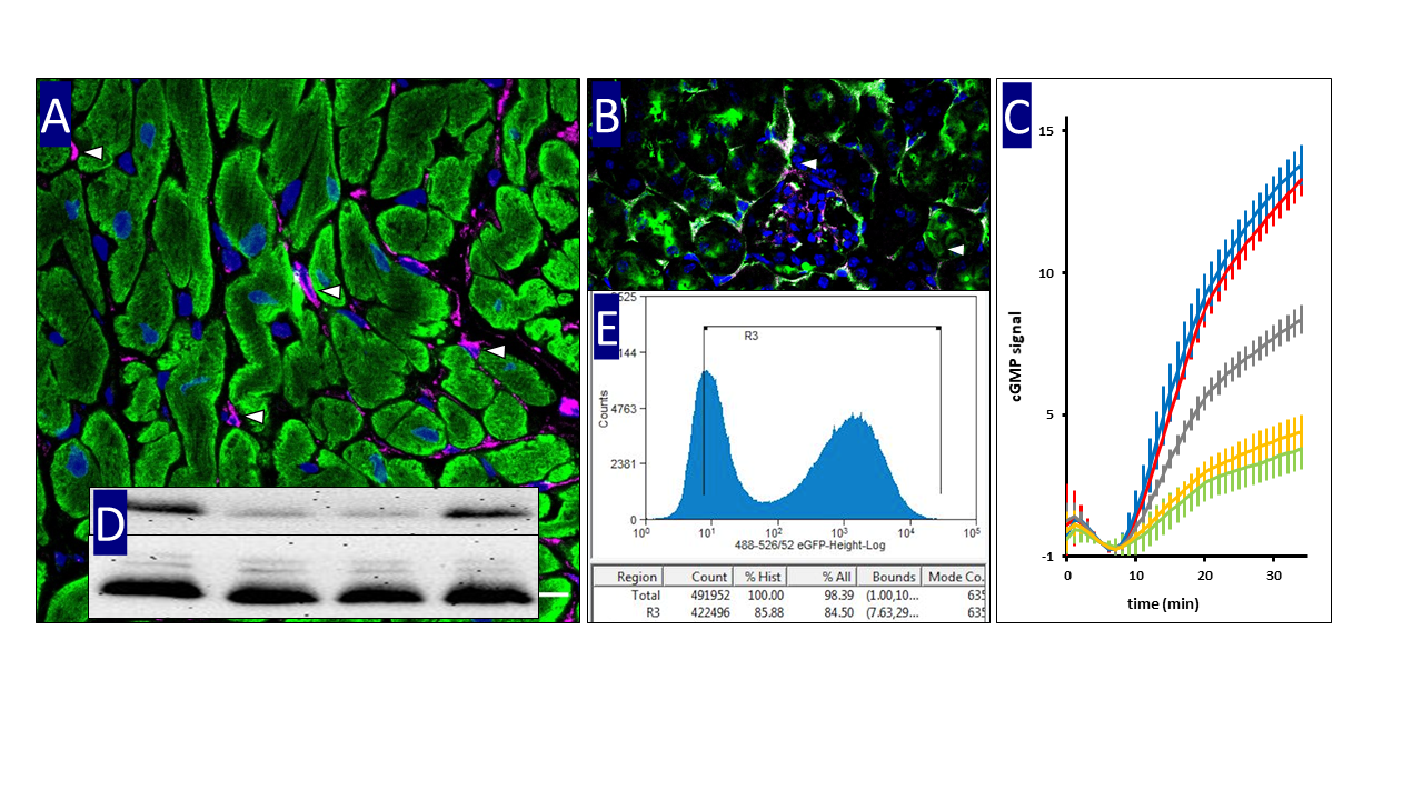 In our research projects, we investigate the presence, regulation, and subcellular localization of cGMP signaling in cardiac and renal tissues. To this end, we employ a broad range of biochemical techniques, including Western blotting and qPCR, as well as molecular and cell biological approaches such as immunohistochemical staining, fluorescence microscopy, flow cytometry, and genetic methods including transfections. Our experimental work is based on both human cell lines and murine cells and tissue samples.